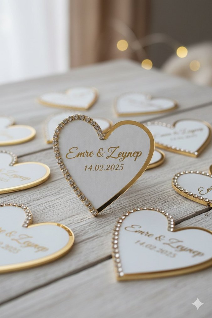 Altın kenarlı, parlak beyaz kalp şeklinde kişiye özel "Emre & Zeynep" ve 14.02.2025 tarihi yazılı hediye