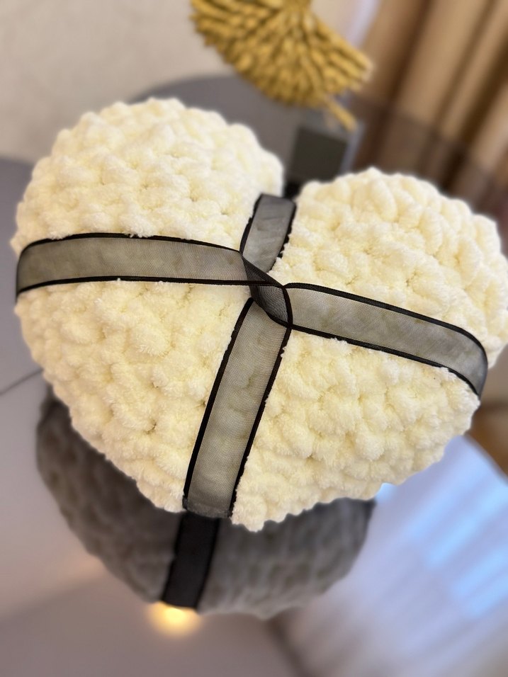 Siyah kurdele detaylı, yumuşak beyaz kalp şeklinde peluş yastık