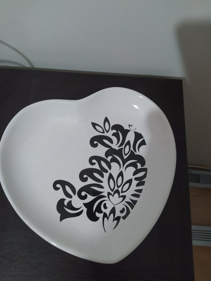 Beyaz kalp şeklinde tabak, koyu renkli baskılı floral desenle süslenmiş, geleneksel tarzda.