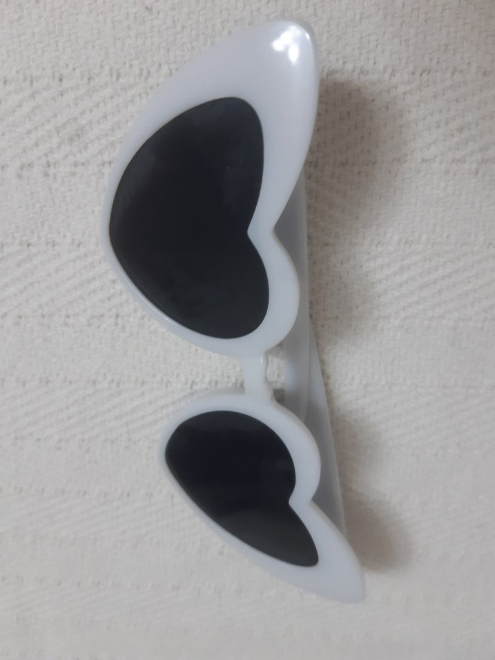 Kalp şeklinde siyah lenslere sahip beyaz güneş gözlüğü, elastik çerçeveli. Minimalist ve retro tarzları goth dokunuşuyla birleştirir. ️
