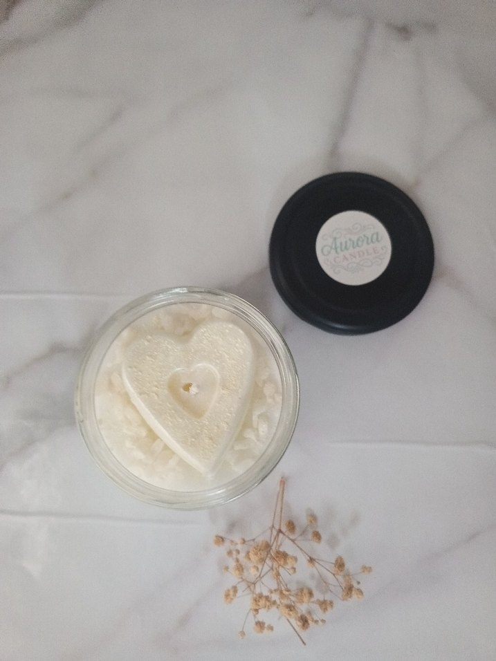 Beyaz kalp şekilli tasarıma sahip mum, siyah kapaklı cam kavanozda sunulmuştur. Pastel tonlarıyla sakin bir ortam yaratır. ️