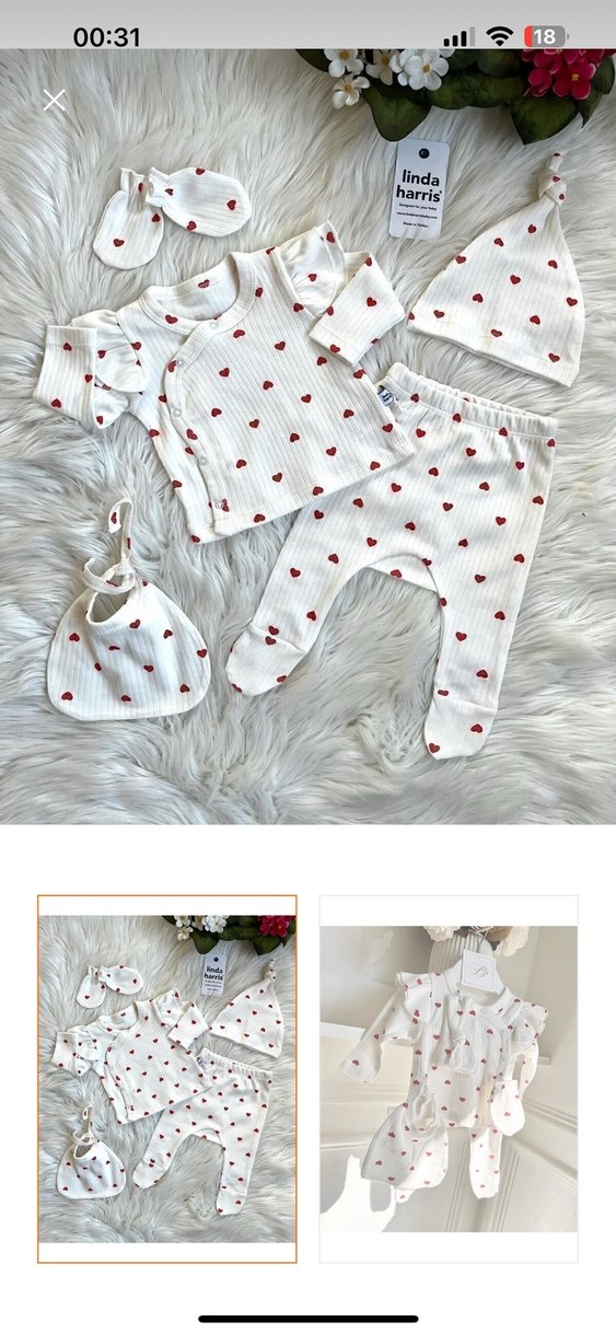 Nakışlı kırmızı kalp desenli, örgü beyaz bebek kız hastane takımı; üst, ayaklı pantolon, şapka, eldiven ve önlük içerir. ❤️ hiç kullanılmadı