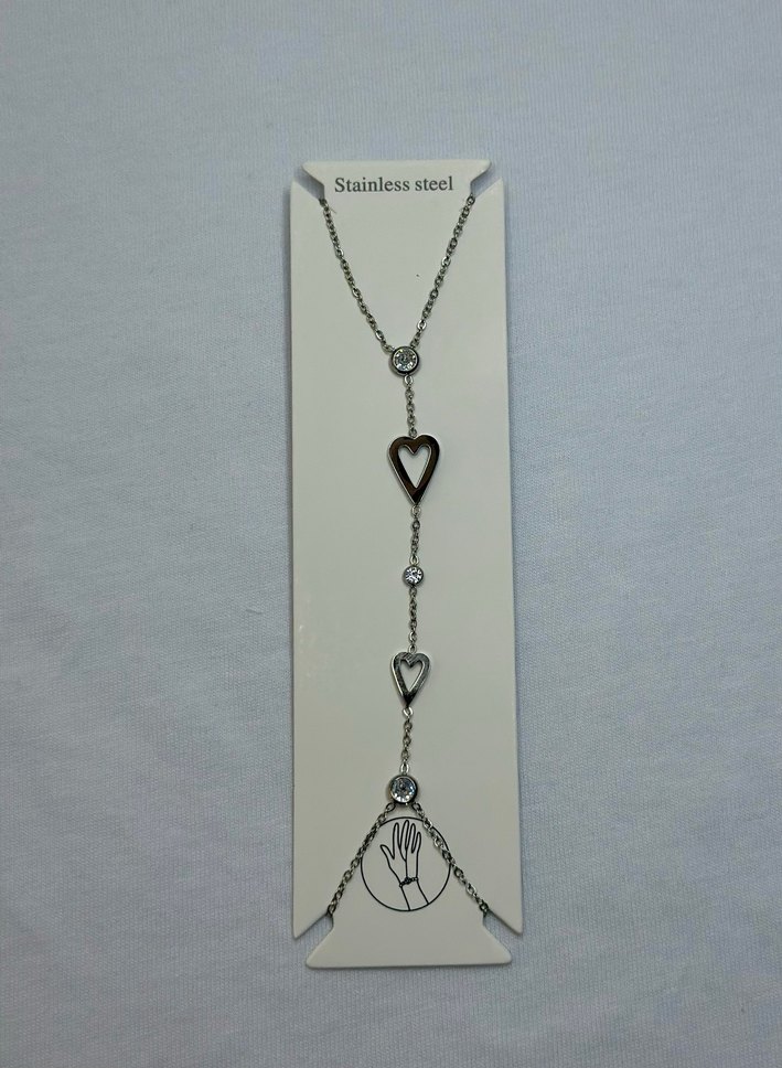 Paslanmaz çelikten yapılmış kalp detaylı ince zincirli kadın el aksesuarı. Beyaz, hafif baskılı tasarımı günlük kullanım için uygundur.