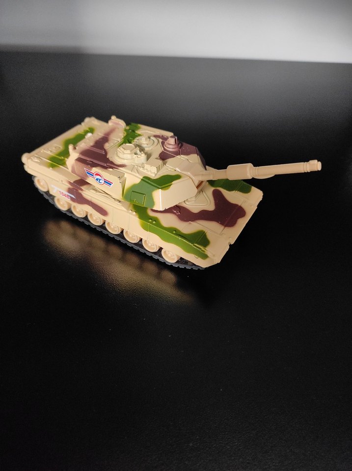 Beyaz zemin üzerine yeşil ve kahverengi kamuflaj desenleri bulunan hafif renkli oyuncak tank. Detaylı paletleri ve hareketli kulesi vardır.
