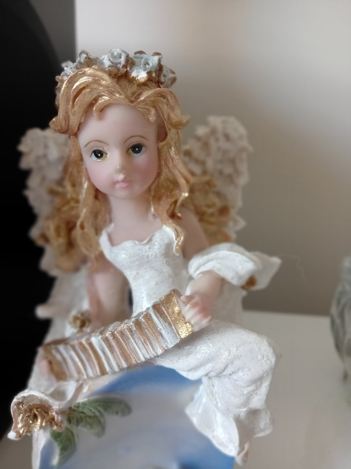 Altın detaylı, çiçek tacı takmış beyaz kanatlı melek biblo. Altın renkli arp tutuyor. Hafif ve zarif dekoratif ürün.
