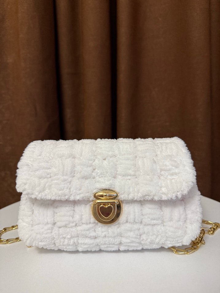Beyaz renkte, kadife ip , altın zincir askılı kadın çantası. Kalp şeklinde altın toka ile modern klasik ve rahat dokunuş sunar. Kanvas çanta yeni yapılmıştır hiç kullanılmamıştır. sıfır üründür.