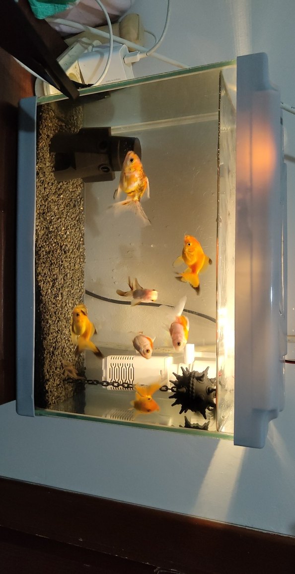 Altında çakıl bulunan, içinde birkaç balığın yüzdüğü beyaz kapaklı akvaryum. Temiz ve açık renkli tasarıma sahip.