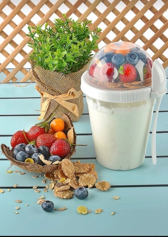 Beyaz kapaklı çok bölmeli saklama kabı, taze meyveler için üst bölüm içerir. Yoğurt ve atıştırmalıkları ayrı saklamak için uygundur. 3 adet elimde var gri- bej
