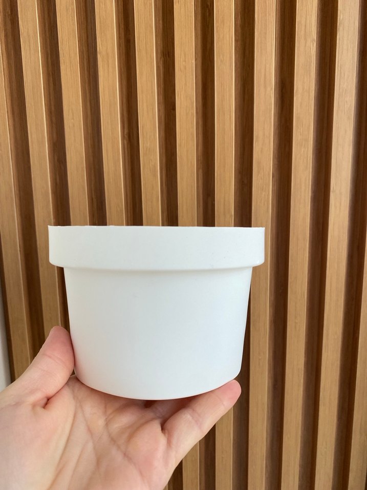 Beyaz kapaklı, pürüzsüz ve sade tasarıma sahip el kremi kavanozu. Taş tozundan hazırlanmış saksı Boyanabilir ürünler