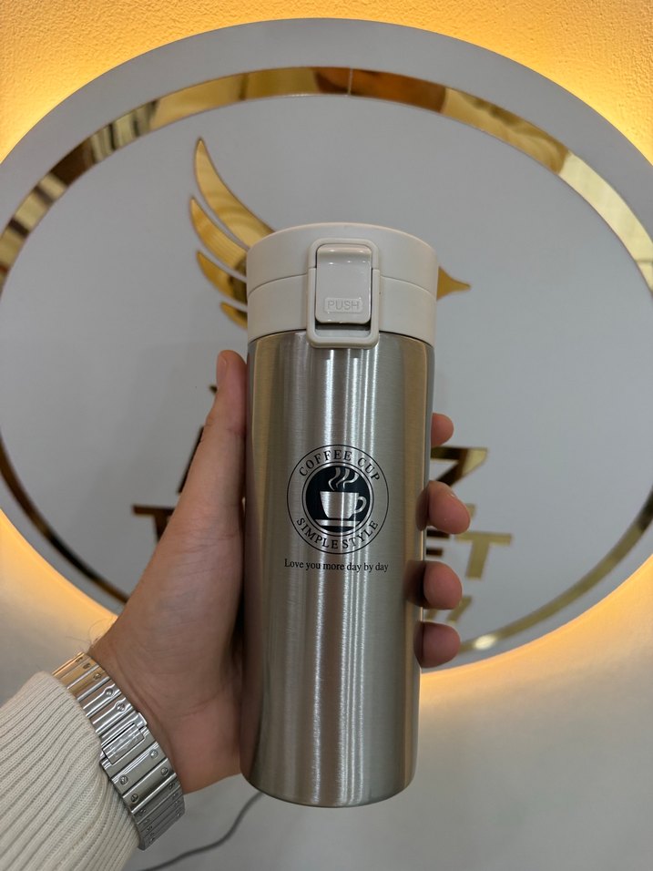 Beyaz kapaklı, gri renkte çocuk termos matara. Kilitli açma mekanizması ve kahve temalı logo bulunur. Sıcak içecekleri korur. ☕