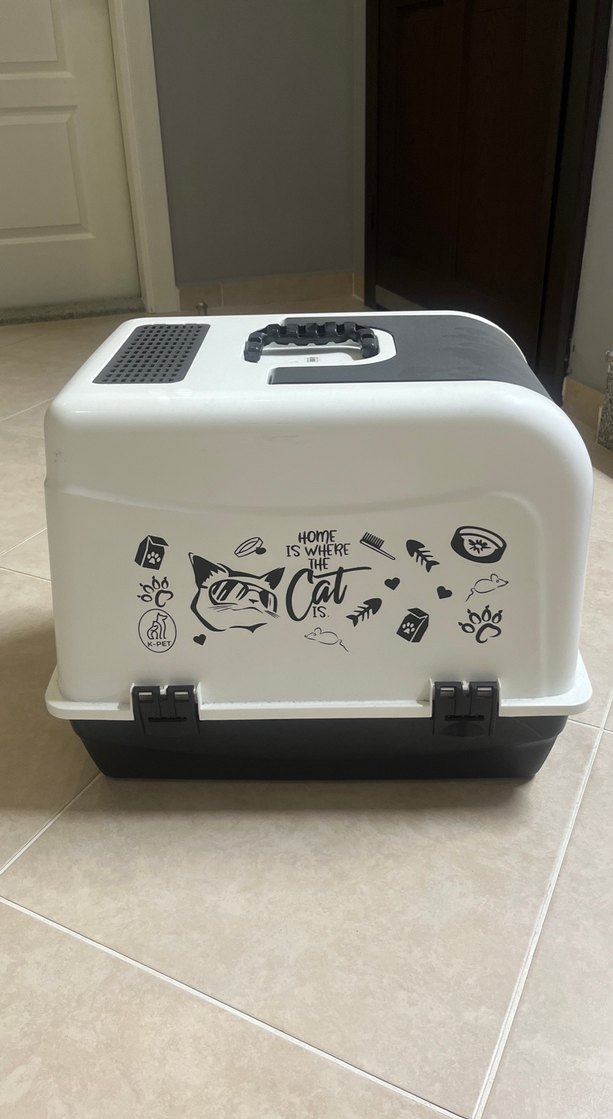 Üstünde taşıma sapı ve havalandırma delikleri bulunan beyaz kedi taşıma ve tuvalet kutusu, koyu renk tabanıyla sağlam ve kolay temizlenir.