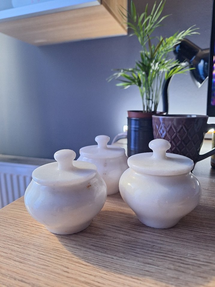 Üç beyaz kapaklı onyx mermer baharatlıktan oluşan set, sade ve klasik tasarıma sahiptir. Desensiz ve kullanımı pratiktir. ️