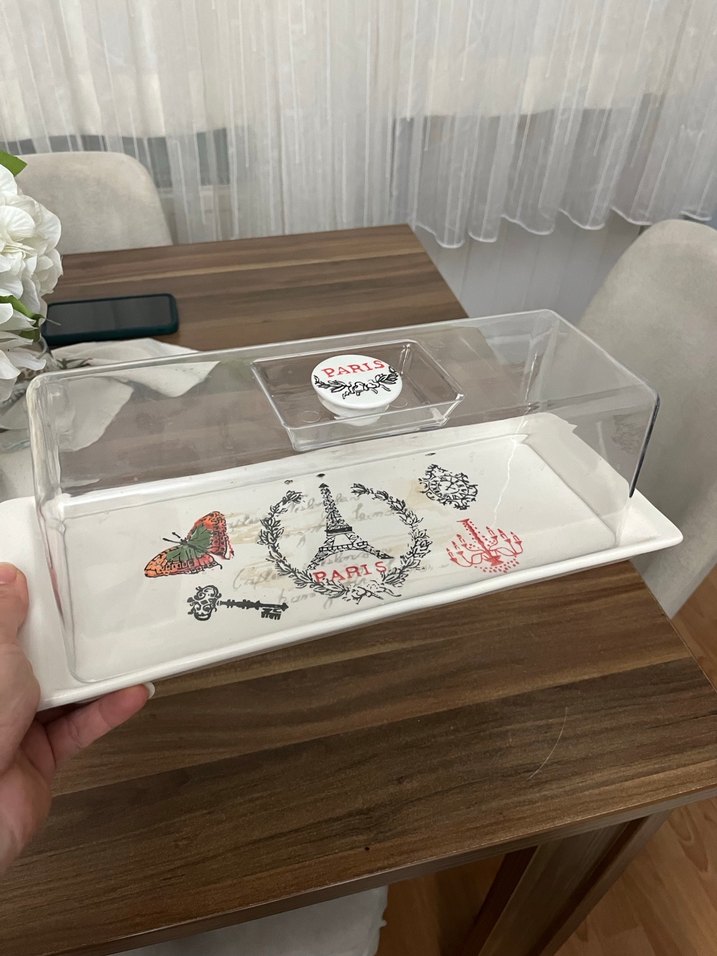 Paris temalı desenler ve kelebek figürü bulunan beyaz pasta kabı, şeffaf kapaklıdır ve yuvarlak kulpludur .