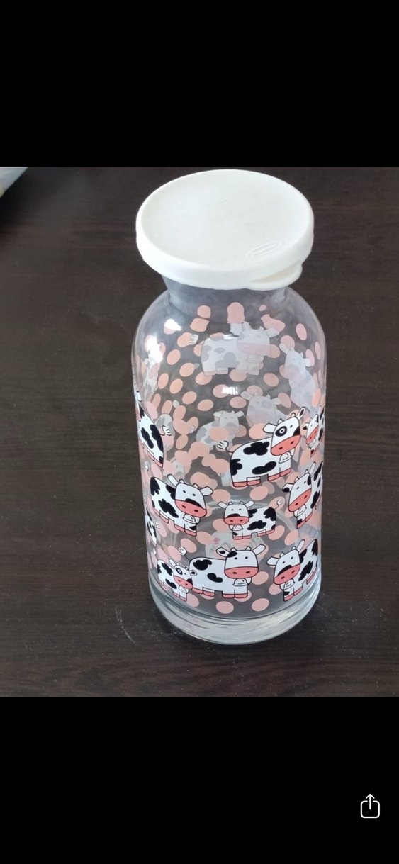 Beyaz kapaklı cam biberon, renkli inek desenleri ve pembe noktalarla süslenmiştir. Kullanımı ve temizliği kolaydır.
