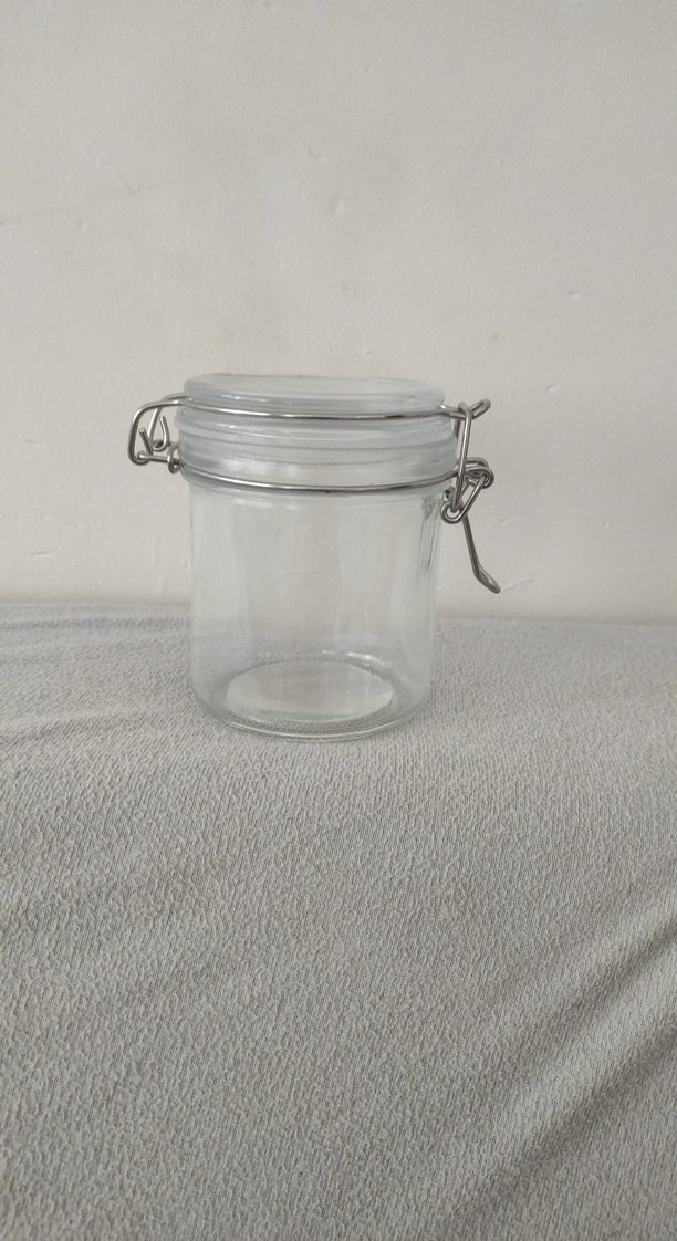 Beyaz kapaklı ve metal kilitli şeffaf cam kavanoz, çeşitli malzemelerin saklanması için uygundur.