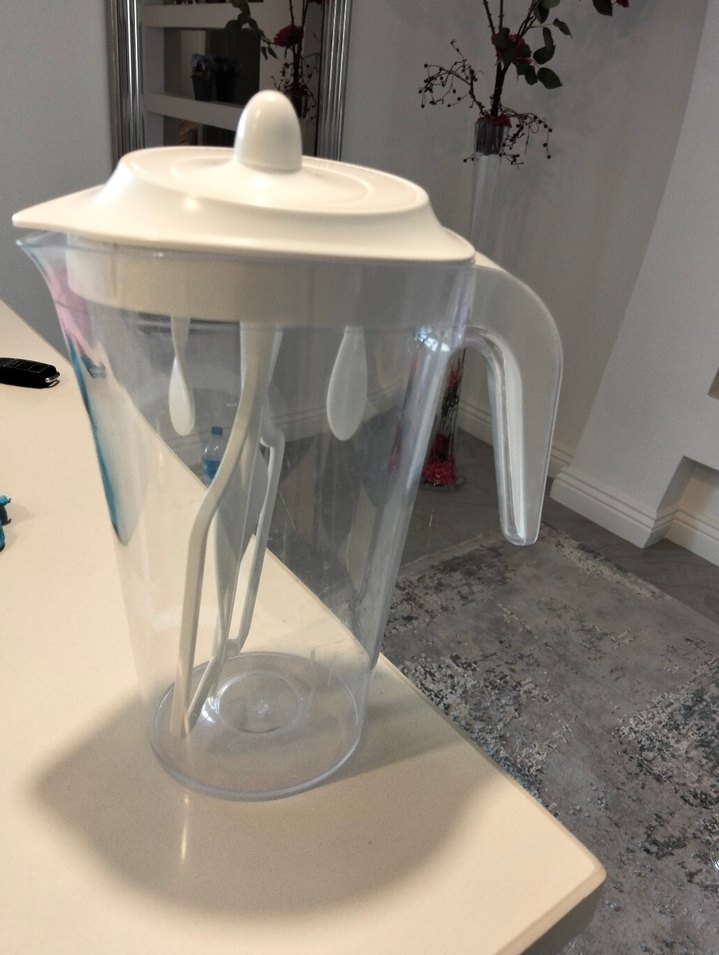 Şeffaf gövdeye sahip bu su sürahisi beyaz kapak ve kulpla kolay dökme sağlar. ayran çırpmak için uygundur