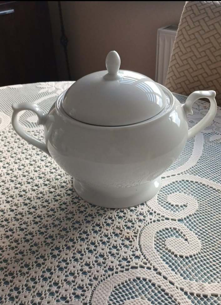 İki kulplu ve kapaklı, desensiz beyaz seramik çorba kasesidir.