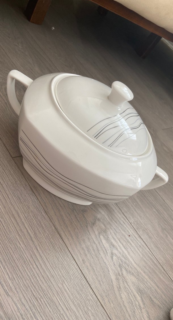 Kenarlarında kulplar ve kapağında ince gri çizgiler bulunan beyaz seramik çorba tenceresi. Sade ve kullanışlı tasarım.