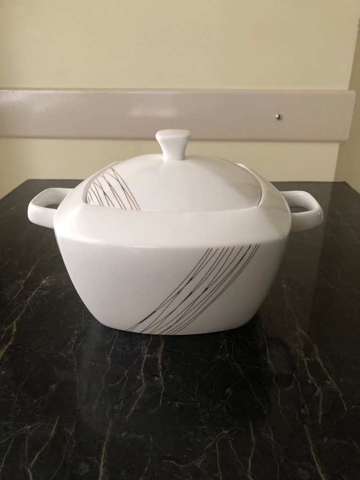 Gri çizgili, kulplu beyaz seramik kapaklı güveç tenceresi. Servis için uygundur.Birinci sınıf kalite Kütahya porselen,büyük boy 4,5 lt dir.Yoğurt mayalamak için de kullanılır.