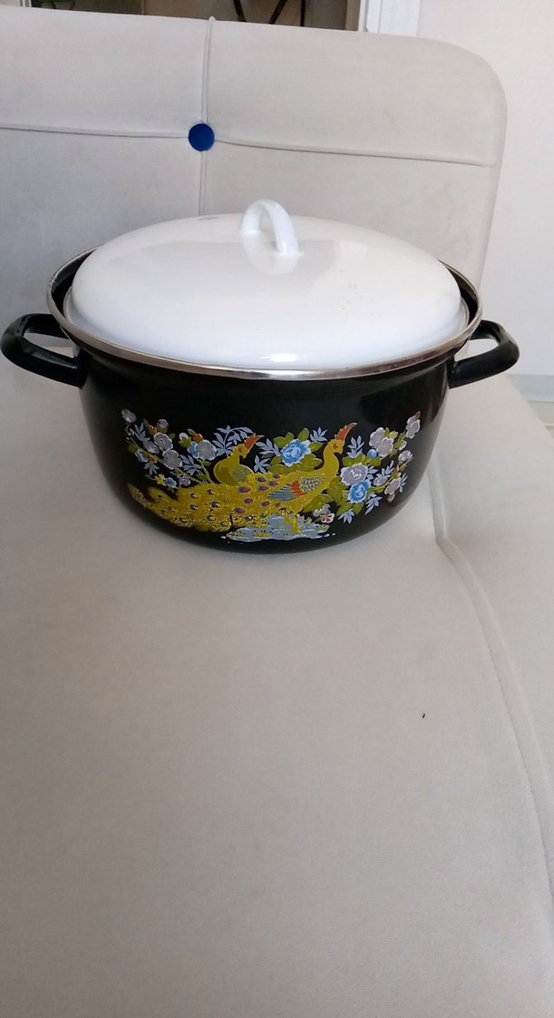 Renkli tavuskuşu ve çiçek desenli siyah emaye tencere, beyaz kapaklı ve iki yanda tutma saplıdır.