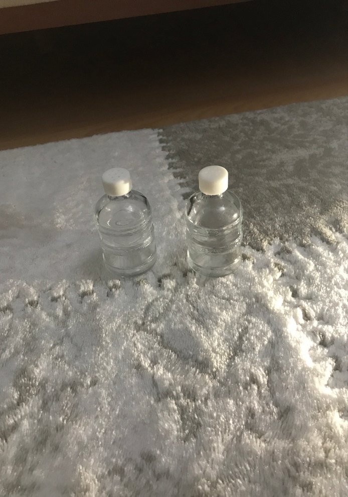 İki adet beyaz kapaklı, şeffaf gövdeli bebek biberonu, gri ve beyaz dokulu bir zeminde yer alıyor.