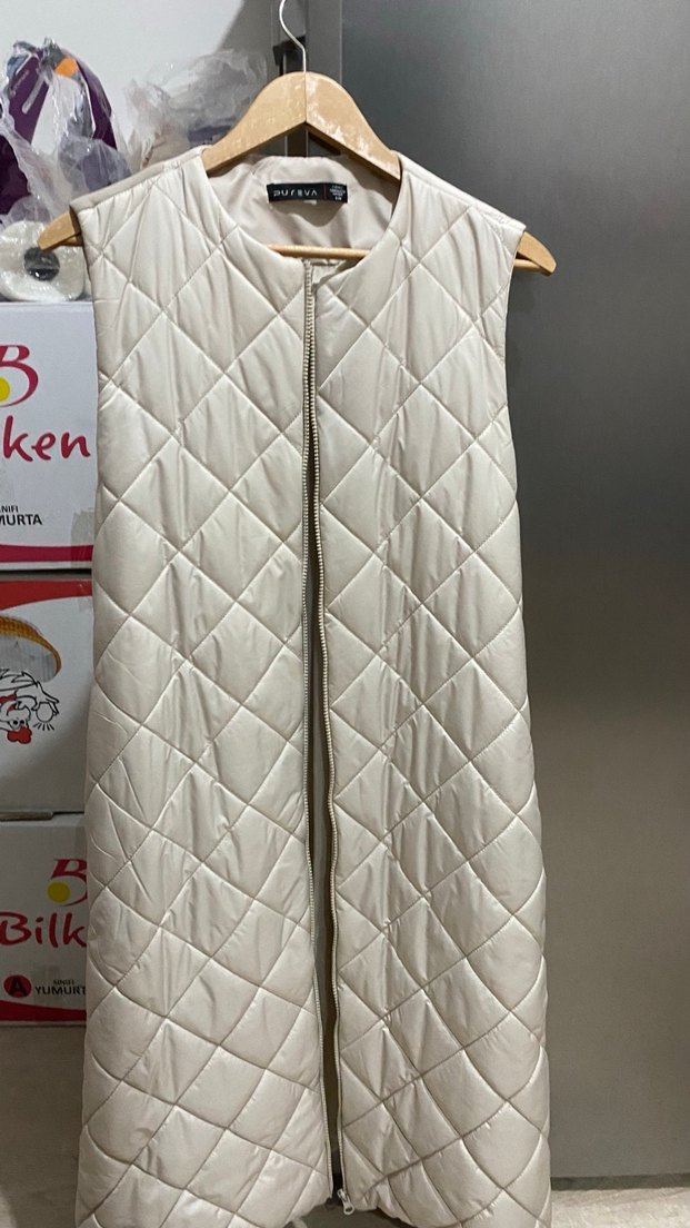 Kapitone desene sahip krem, fermuarlı ve kolsuz kadın yelek. Notlu yaka ve normal kesim, günlük rahat sokak stiline uygun.