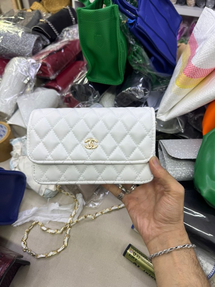 Sentetik kumaştan beyaz kapitone kadın çanta, fermuarlı ve zincir askılı. Trendy günlük sokak stiline uygun.