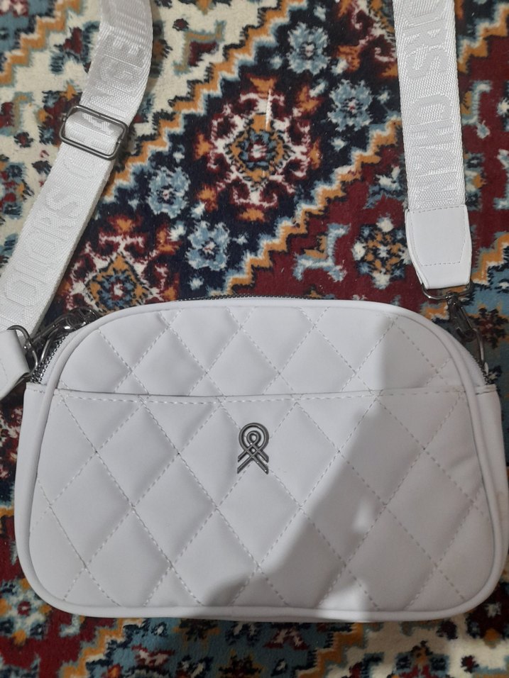 Beyaz kapitone desenli, kemerli kayışa sahip günlük kullanıma uygun kadın çantası.