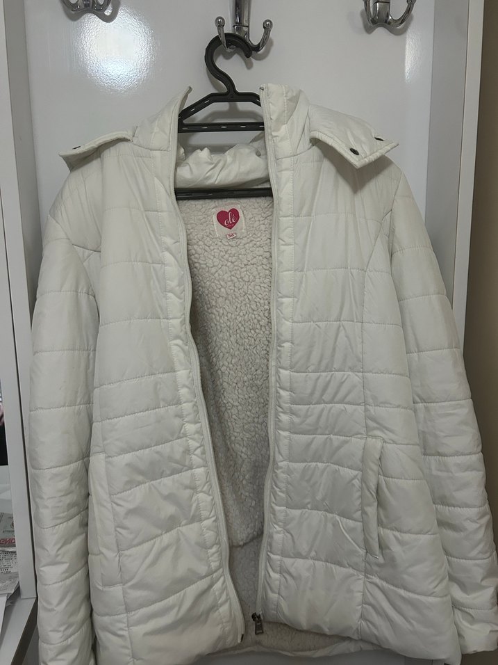 Beyaz kapitone dış yüzeye sahip, içi yumuşak ve sıcak astarlı, kürk detaylı, uzun kollu ve kesimi vücuda oturan kiz cocuk mont.