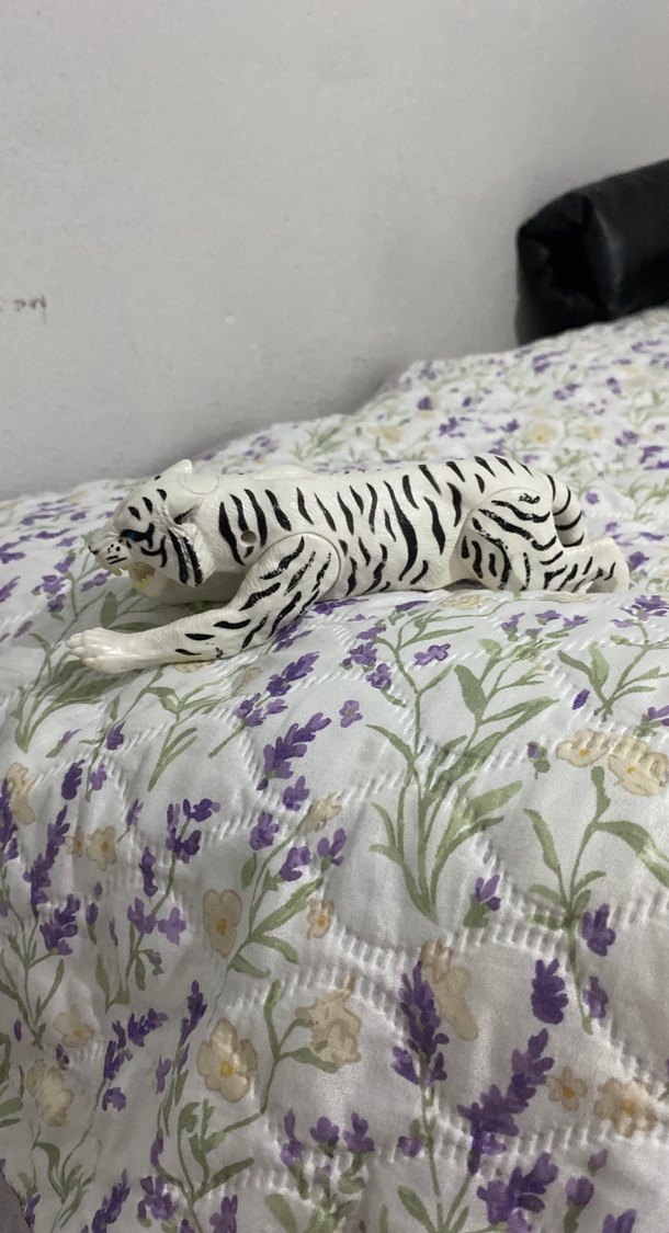 Pastel tonlarda beyaz kaplan figürini, uzanır pozisyonda tasarlanmış. Kaplanın çizgilerini ve formunu zarif şekilde yansıtıyor.