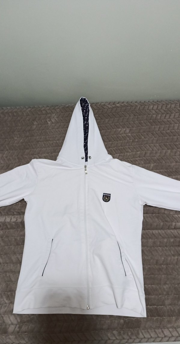 Fermuarlı ve kapüşonlu, beyaz renkte yumuşak kumaştan yapılmış, fitted kesim kadın hırka. Gri detaylar bulunur, günlük sokak stili için uygundur.