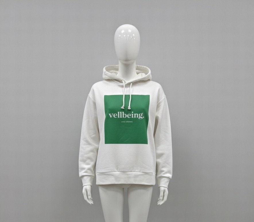 Beyaz, uzun kollu, yuvarlak yakalı, rahat kesim kadın sweatshirtü. Üzerinde yeşil baskılı kare ve "vellbeing." yazısı bulunur. Yumuşak ve sıcak kumaştan,Günlük kullanım için uygundur.