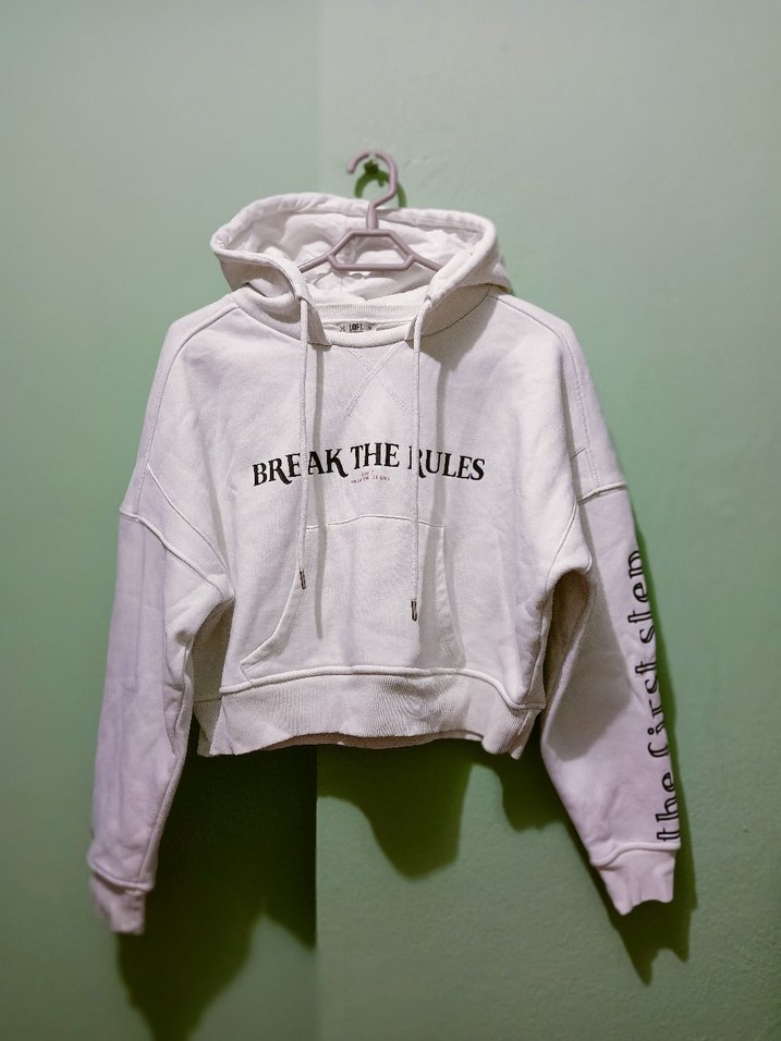 Yumuşak fleece kumaştan beyaz kapüşonlu sweatshirt, uzun kollu ve rahat kesimdir. Önünde 'BREAK THE RULES' yazısı ve kolunda baskı bulunur. Crop