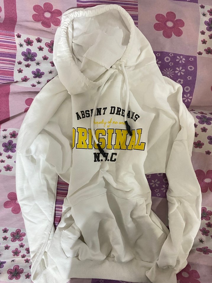 Beyaz kapüşonlu, bol kesim sweatshirt, önünde renkli baskılı "ORIGINAL" yazısı, sentetik kumaştan günlük rahat kullanım için.