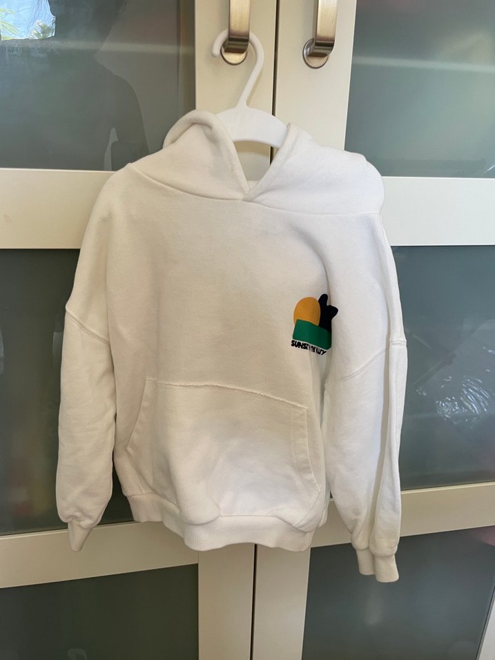 Beyaz kapüşonlu sweatshirt, rahat kesim ve uzun kollu, yumuşak ve sıcak kumaştan. Baskılı desen ve ön cep içerir, günlük kullanım için uygun.