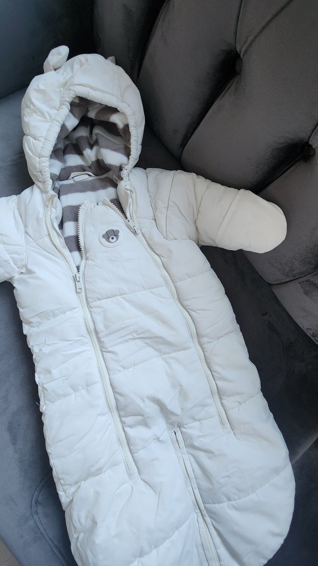 Kapüşonlu ve fermuarlı beyaz bebek kış tulumu. Gri çizgili yumuşak iç astar ve kesik yaka detayı bulunur. ❄️