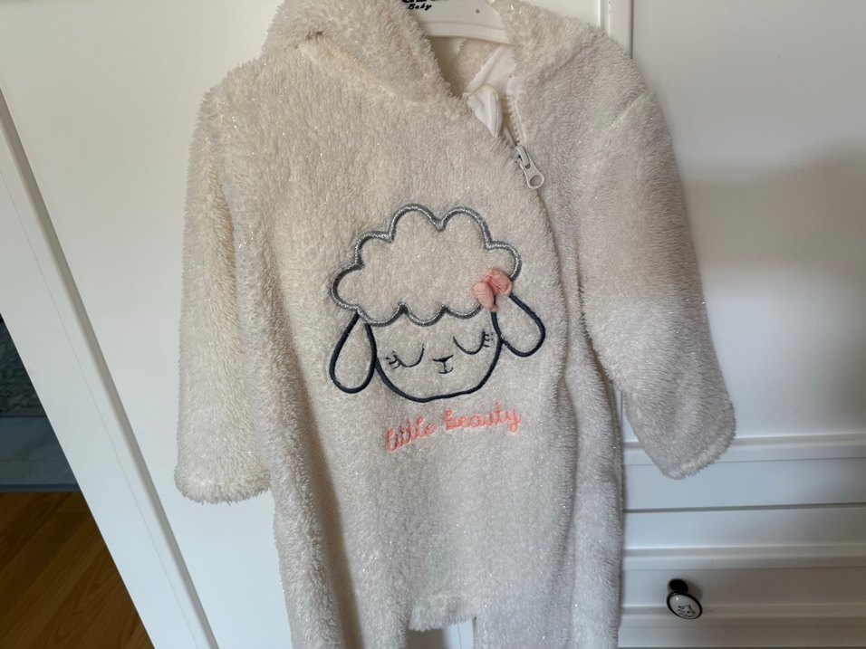 Yumuşak, kürk detaylı kumaş ve kapüşonlu beyaz bebek kız tulumu. Pastel tonlarda baskılı kuzu deseni ve kolay giyilebilen fermuarlı kapanış içerir.Hafif ama sıcak tutan dokusunu bebekleriniz bayılacak