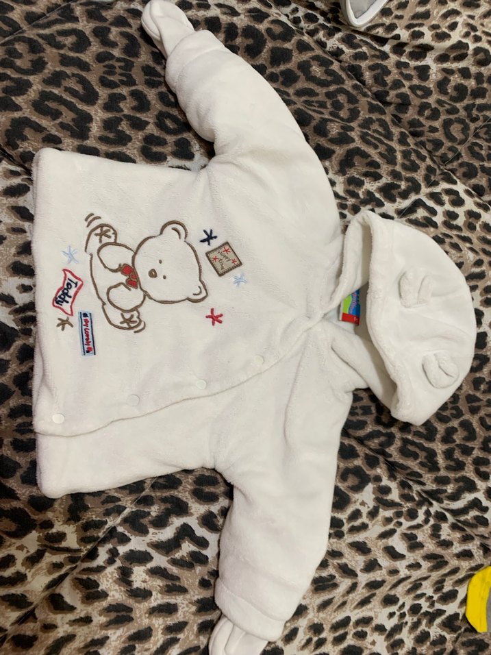 Yumuşak ve sıcak kumaştan yapılmış beyaz bebek montu, kapüşonunda kürk detayları ve baskılı ayı deseni bulunur.