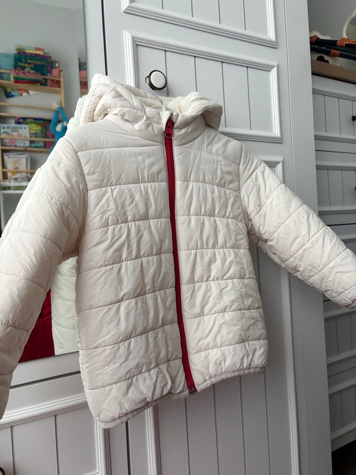 Beyaz renkli, kırmızı fermuarlı, kapüşonlu ve yumuşak kumaştan yapılmış çocuk montudur. Streetwear tarzında, vücuda oturan kesime sahiptir. Hafif tüylenmeleri var