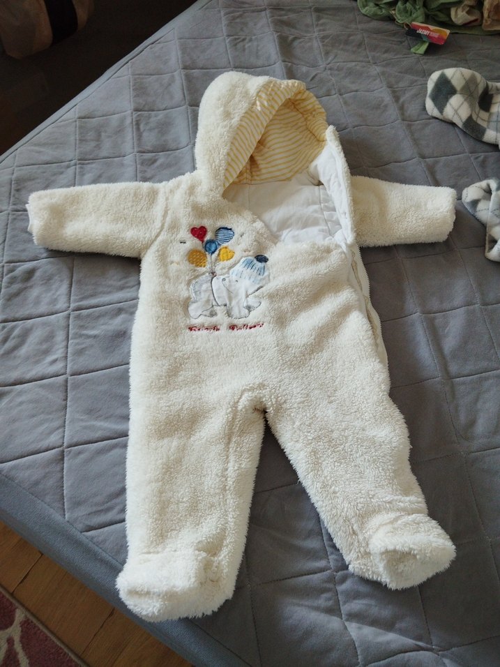 Yumuşak dokulu, kapüşonlu beyaz erkek bebek tulumu, nakışlı desenlerle sıcak tutar. Soğuk havalar için uygundur. ❄️