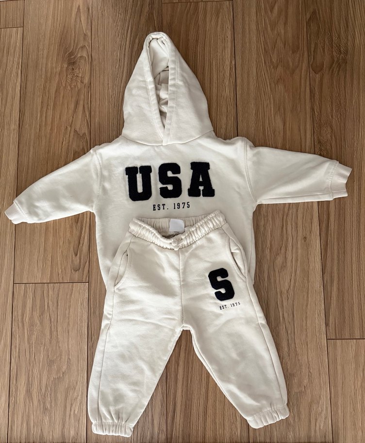 Zara marka, 86cm, defosu yok. Krem renk. Yumuşak ve sıcak kumaştan beyaz kapüşonlu sweatshirt ve bol kesim eşofmandan oluşan erkek çocuk eşofman takımı. Gri baskılı USA ve EST.1975 detaylarıyla sade ve şık.