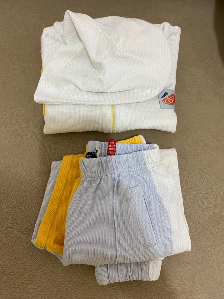 Yumuşak kumaştan beyaz kapüşonlu sweatshirt ve fitted eşofman altı, sade ve desensiz tasarım, gri ve sarı detaylarla. Günlük sokak stili için uygun.
