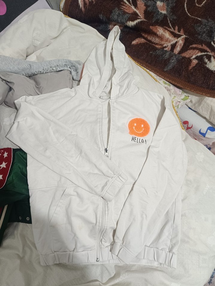 Beyaz, kapüşonlu ve fermuarlı, turuncu gülen yüz ve "HELLO!" yazılı baskılı, bol kesim uzun kollu rahat kumaş ceket.