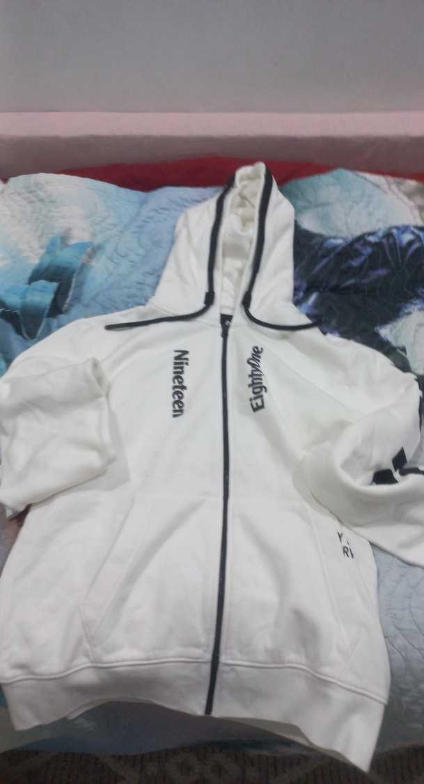 Beyaz kapüşonlu, fermuarlı ve baskılı yazılı erkek sweatshirt. Dar kesim ve uzun kolludur, rahat sokak tarzına uygundur. 'Nineteen' ve 'Eightyhome' yazıları bulunur.