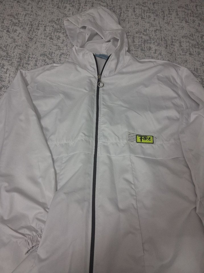 Beyaz kapüşonlu fermuarlı ceket, uzun kollu ve bo yapılmıştır, dış mekan ve sokak stili için uygundur. yağmurluk olarakda kullanılır