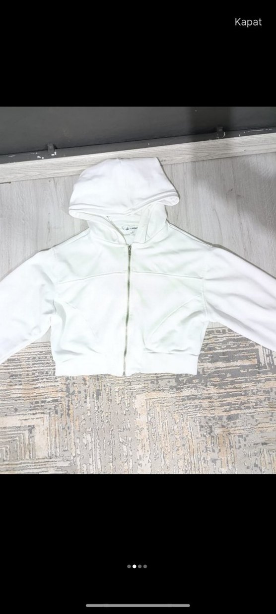 Beyaz, kapüşonlu ve ön fermuarlı bu sweatshirt, uzun kollu ve kısa boyludur. Yumuşak ve sıcak kumaştan üretilmiş, günlük rahat sokak stili için uygundur.