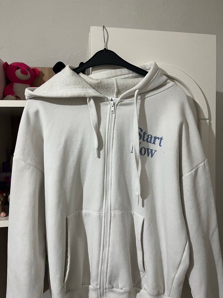 Beyaz renkli, fermuarlı ve kapüşonlu sweatshirt. Uzun kollu, gevşek kesim ve baskılı "Start" yazısıyla rahat ve günlük kullanıma uygun. tek kusuru tüylenmiş olmasıdır onun harici yumusacık güzel bir cekettir
