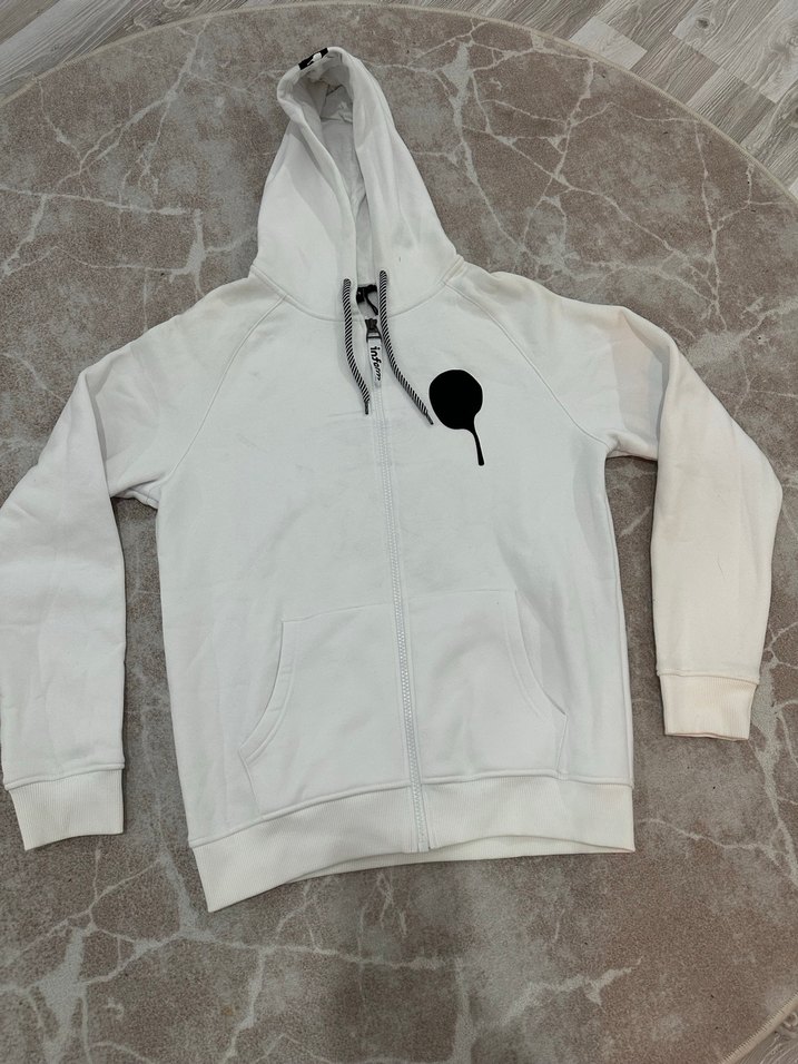 Yumuşak kumaştan, kapüşonlu, fermuarlı, uzun kollu ve normal boyda beyaz kadın sweatshirt. Gri baskı detayıyla günlük kullanıma uygundur. Almanyadan geldi aşırı kaliteli ağır ve kalın polar.