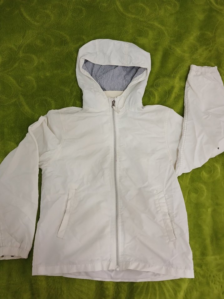 Beyaz Kapüşonlu Fermuarlı Yağmurluk
