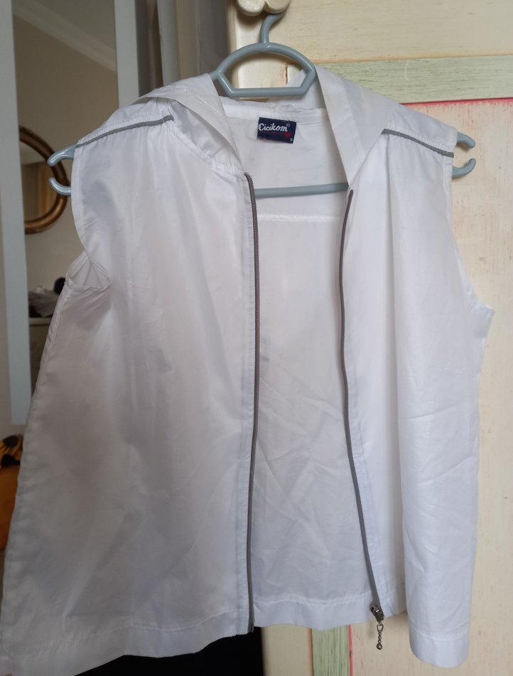 Beyaz Kapüşonlu Fermuarlı Yelek